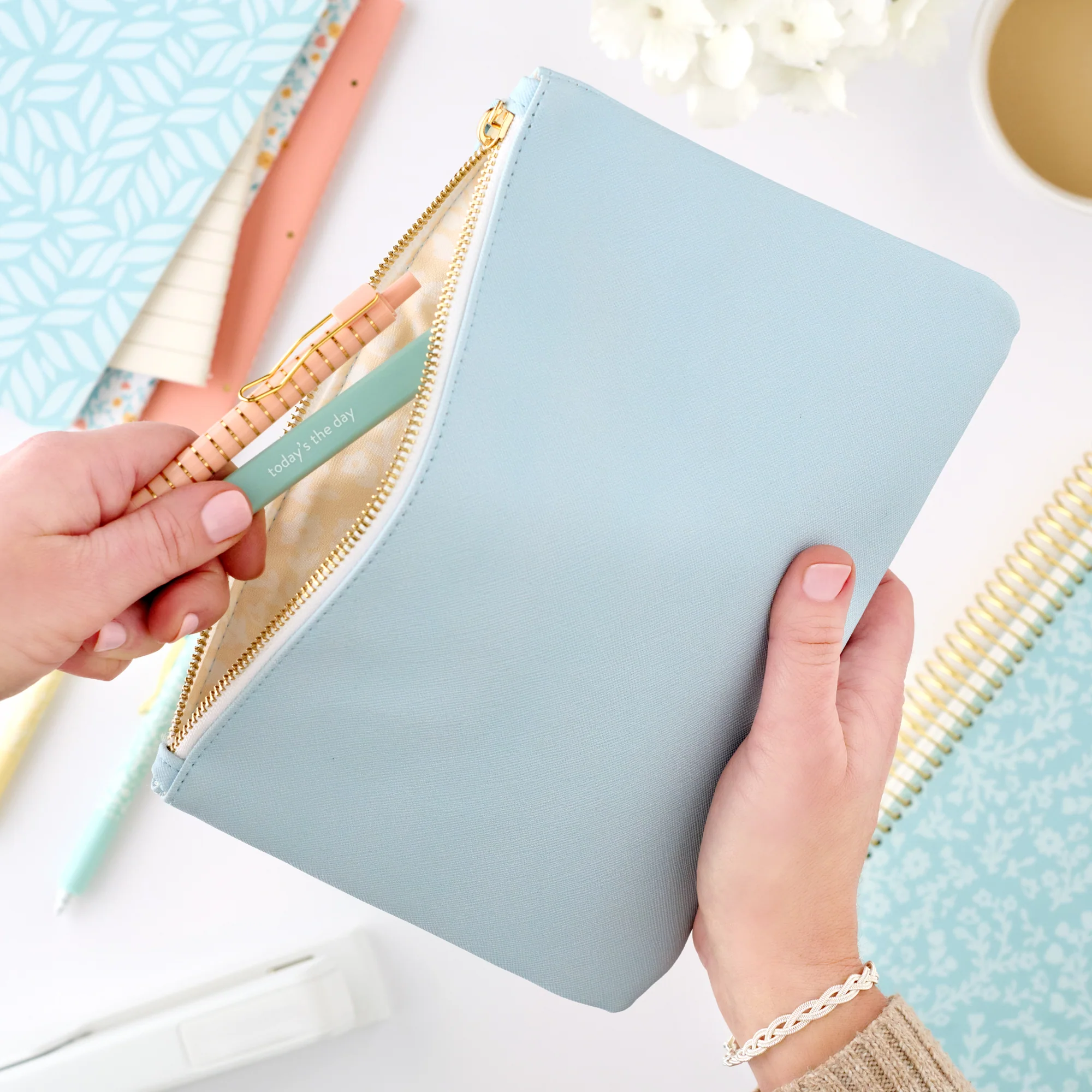 Keep your essentials neatly organized with our adorable blush zipper pouch! It's the perfect little companion for stashing your favorite pens, makeup, money planner envelopes, or any small goodies you need. The blush zipper pouch features durable vegan leather and colorful polyester lining that adds a pop of personality. You’ll love how easy it is to stay organized!